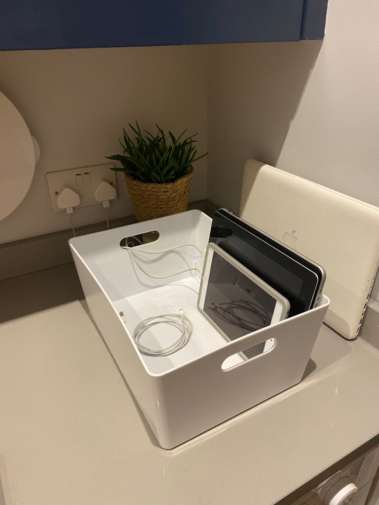 These boxes are brilliant for everything. They come in all sizes. Here I have used one as a charging station. Everyone docks their device at the end of the day! They are by Wham and are called Studio.